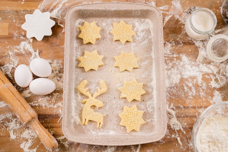 Плоская поднос с двумя рядами сырых печенья, окруженных ингредиентами
