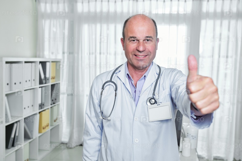 Счастливый доктор, показывающий палец вверх