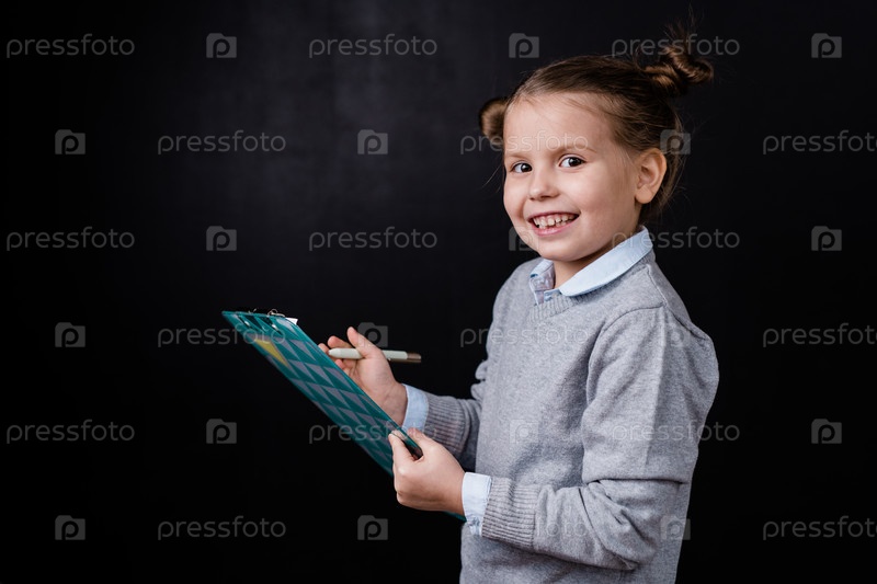 Милая маленькая бизнес-леди в повседневной одежде, держащая клипборд с документом и ручкой