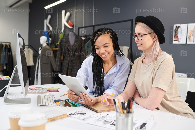 Дизайнеры, использующие планшетный компьютер в студии