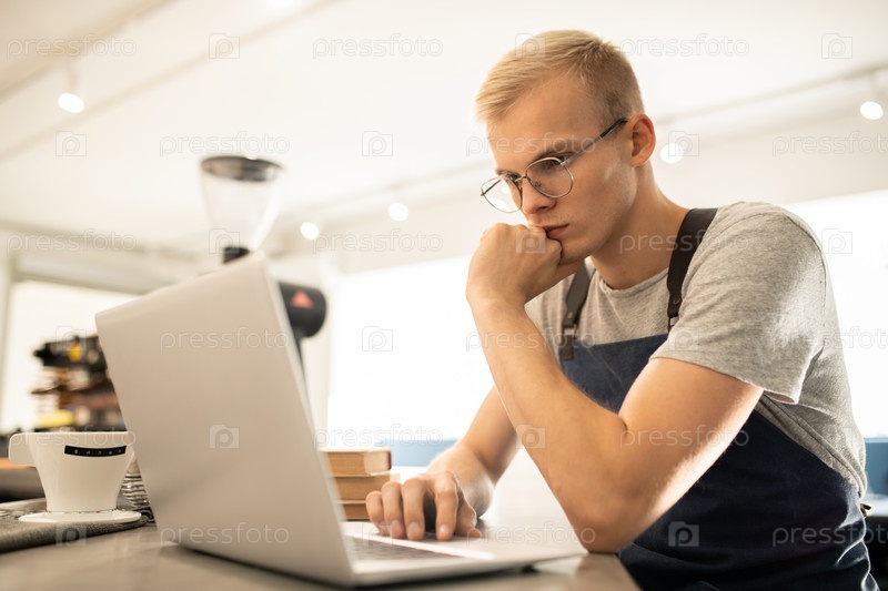 Молодой мыслящий мужчина-бариста в униформе смотрит на онлайн-данные на дисплее ноутбука
