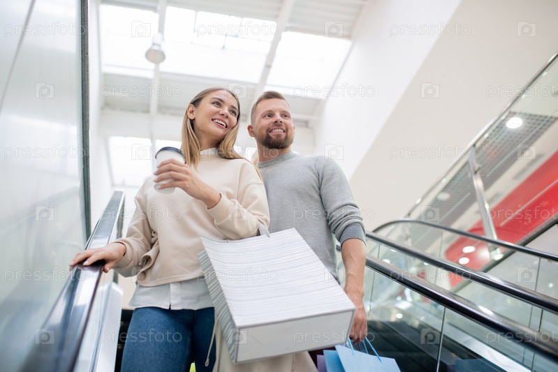 Молодая пара с бумажными пакетами движется вниз по эскалаторам во время покупок