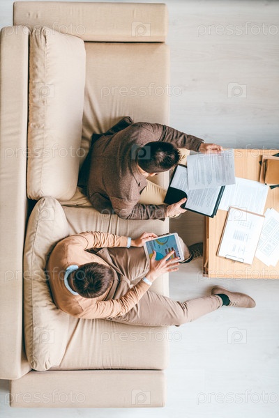 Молодые брокеры сидят на диване в офисе и работают с финансовой информацией