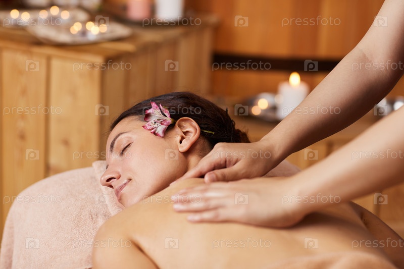 Привлекательная молодая женщина с красивым цветом в волосах, лежащая на массажном столе и закрывая глаза, наслаждаясь ароматным массажем