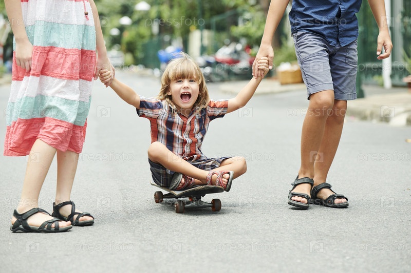 Счастливый взволнованный ребенок на скейтборде