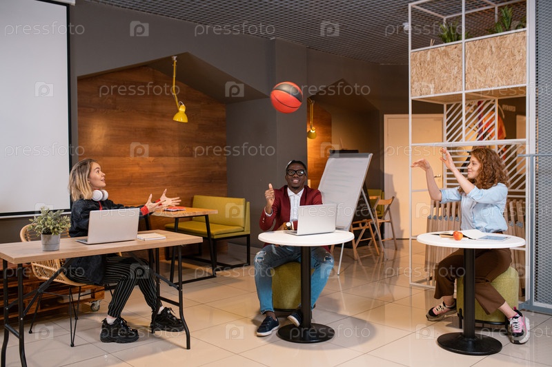 Трое счастливых молодых студентов бросают друг другу мяч, сидя в кафе