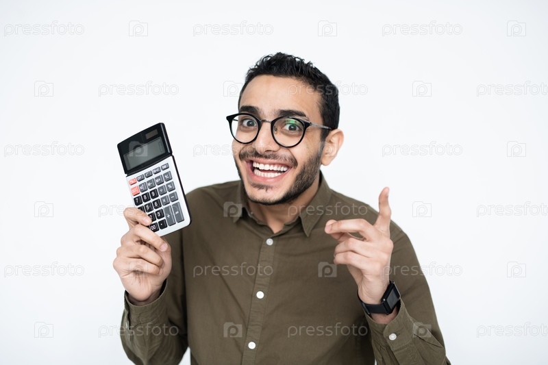 Молодой студент смотрит на вас с зубчатой улыбкой, показывая калькулятор