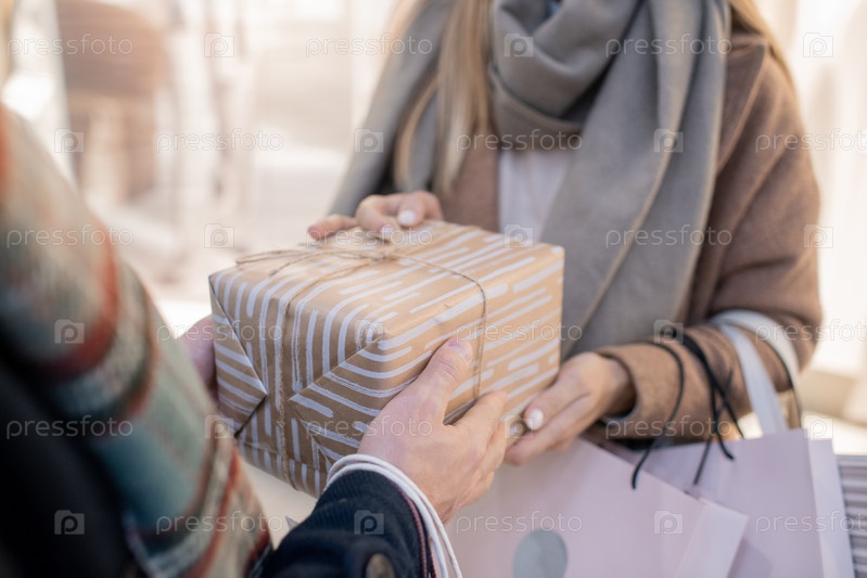 Руки молодого человека, передающего упакованную подарочную коробку своей девушке с бумажными пакетами