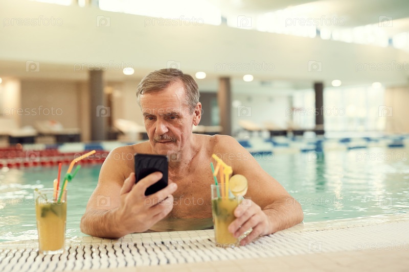 Современный пожилой человек использует смартфон в бассейне