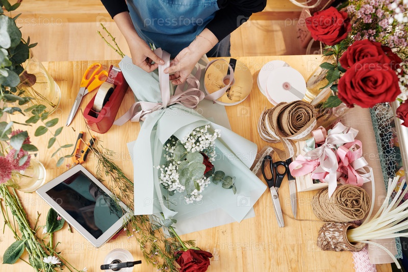 Цветочник, связывающий ленту букета