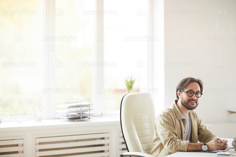 Портрет улыбающегося красивого азиатского офисного сотрудника с наручными часами, сидящего за столом во время работы в современном офисе