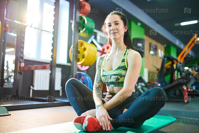 Спортсменка, сидящая в спортзале