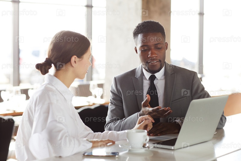 Контент уверенный молодой чернокожий мужчина в костюме, указывающий на монитор ноутбука во время презентации проекта коллеге на встрече в кафе