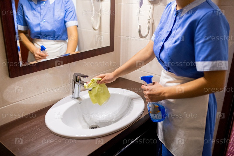 Молодая горничная в униформе убирает раковину с моющим средством в ванной