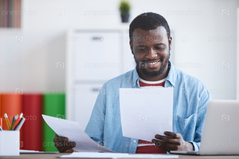 Веселый красивый молодой чернокожий менеджер с бородой сидит за столом в офисе и просматривает результаты исследования продаж