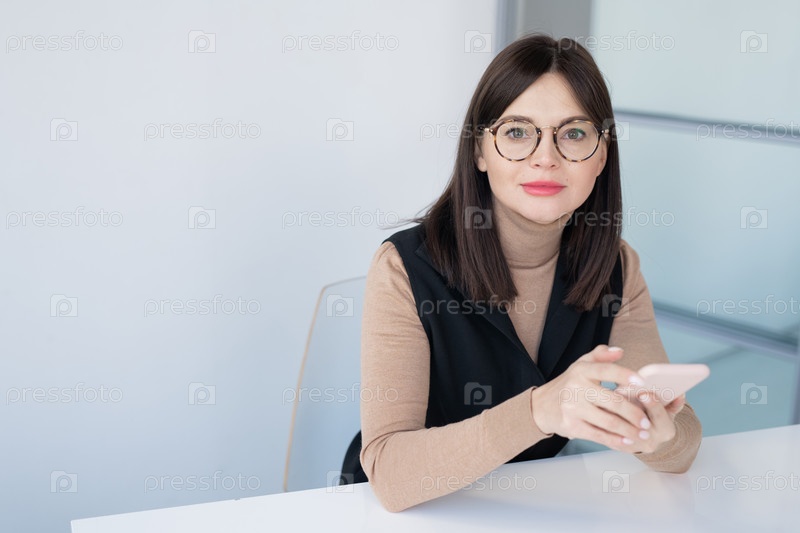 Красивая молодая бизнес-леди в умном casual и очках с помощью смартфона