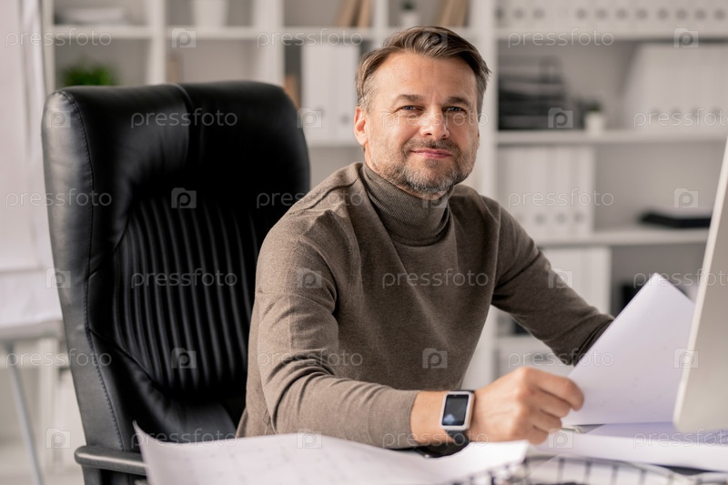 Успешный зрелый инженер с документами, которые смотрят на вас в кресле у стола