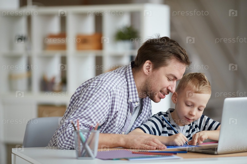 Улыбающийся красивый молодой отец в обычной рубашке сидит за столом и помогает сыну с домашним заданием