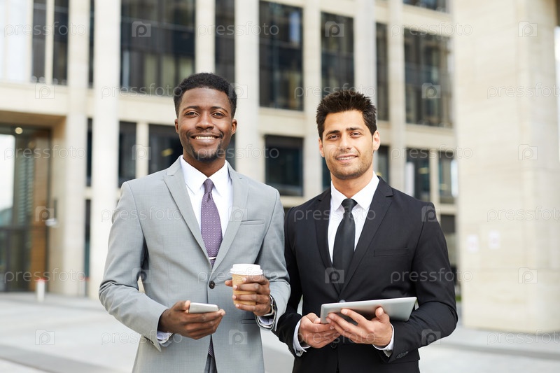 Два менеджера работают на открытом воздухе