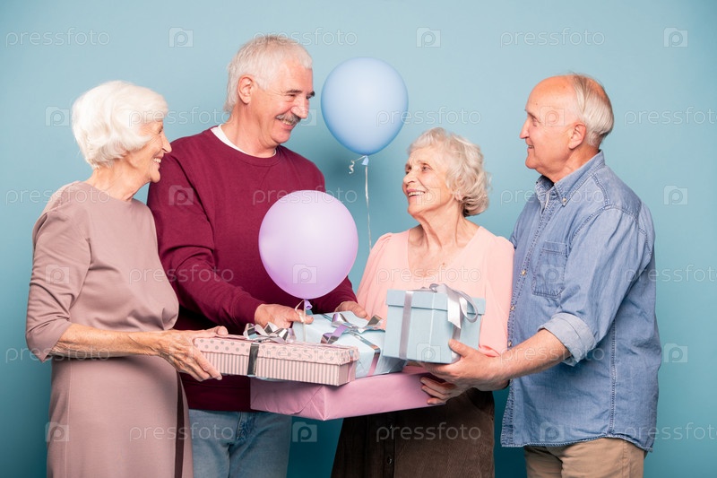 Веселая компания дружелюбных пенсионеров с воздушными шарами и коробками для подарков