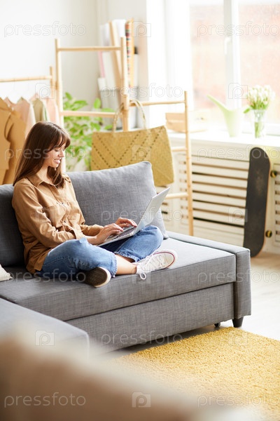 Содержание талантливой молодой женщины с коричневыми волосами, использующей ноутбук во время работы над собственной маркой одежды