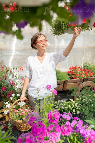Молодая женщина с корзиной свежих цветов стоит у клумбы