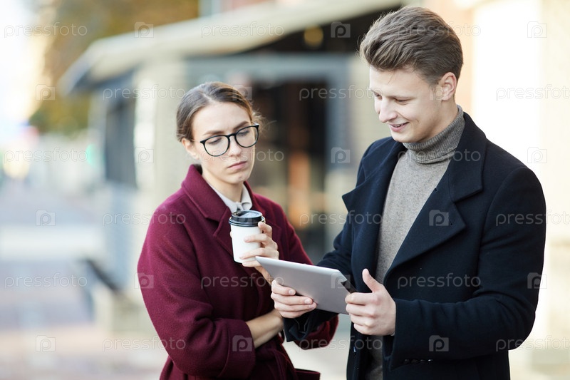 Вдумчивые молодые маркетологи в осенних пальто стоят на улице и анализируют дизайн приложений на планшете