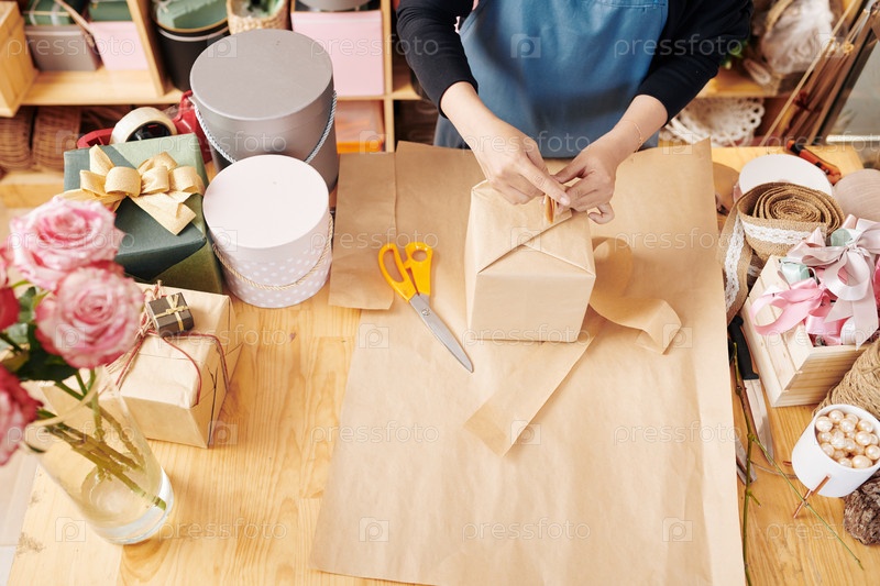Женщина обертывает подарок в бумагу