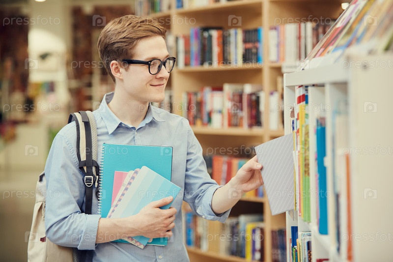 Улыбающийся красивый студент-мальчик в очках стоит на полке и выбирает учебник, покупая его в книжном магазине
