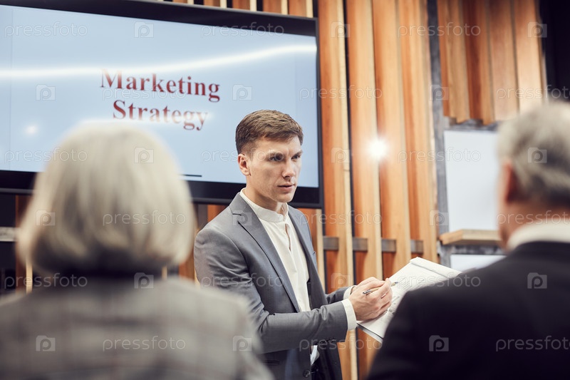 Серьезный красивый молодой специалист по SMM в сером костюме, указывающий на статистическую бумагу во время выступления о маркетинговой стратегии на конференции