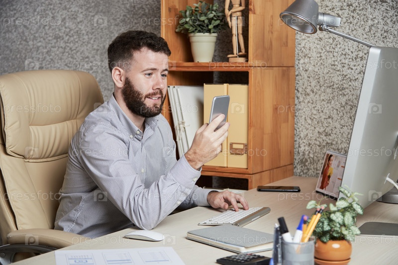 Бизнесмен, использующий мобильный телефон во время работы