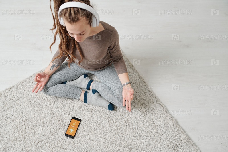 Вид на спокойную молодую женщину в наушниках, сидящую в позе лотоса