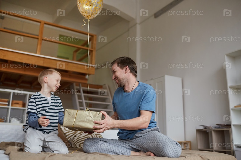 Счастливый красивый молодой отец в пижаме празднует день рождения сына и дарит подарки с воздушным шаром утром