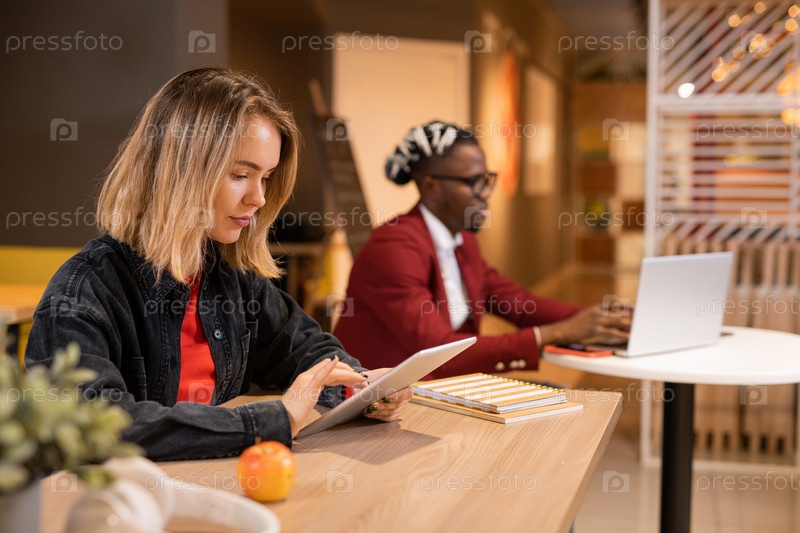 Серьезная блондинка сидит за столом в кафе колледжа и прокручивает на сенсорной панели