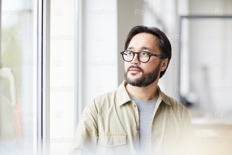 Серьезный созерцательный молодой азиатский мужчина в обычной рубашке и очках сидит в офисе и смотрит из окна