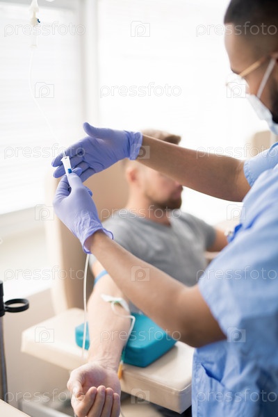 Клиник, держащий часть капельницы с лекарством во время лечения пациента