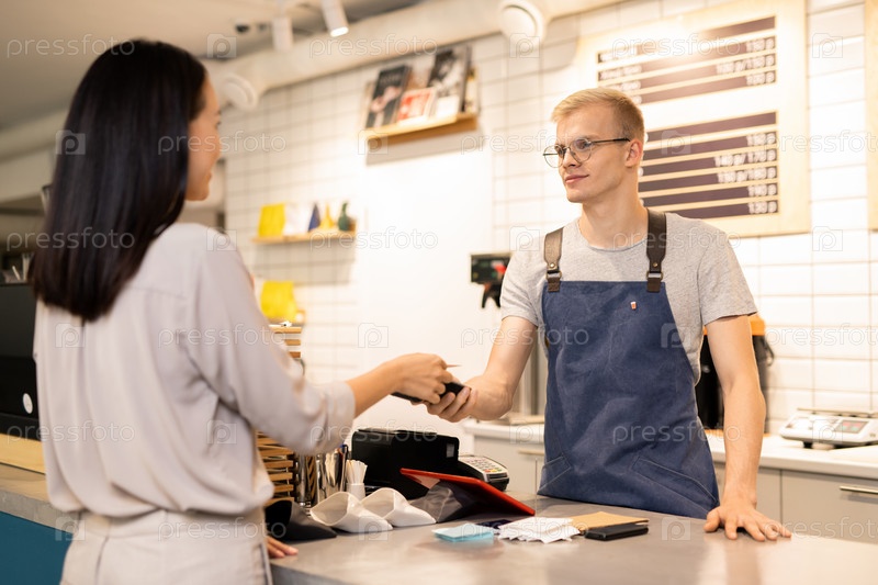 Молодой официант держит электронный платежный автомат, в то время как клиент платит за напиток