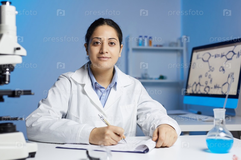 Портрет содержимого Молодая индийская экспертка по лаборатории в белом пальто сидит за столом в офисе и записывает опыты