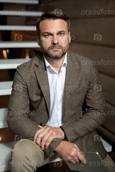 Уверенный бизнесмен средних лет в формальной одежде, сидящий на лестнице