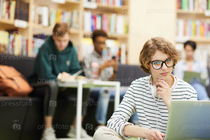 Умная студентка работает над проектом в библиотеке