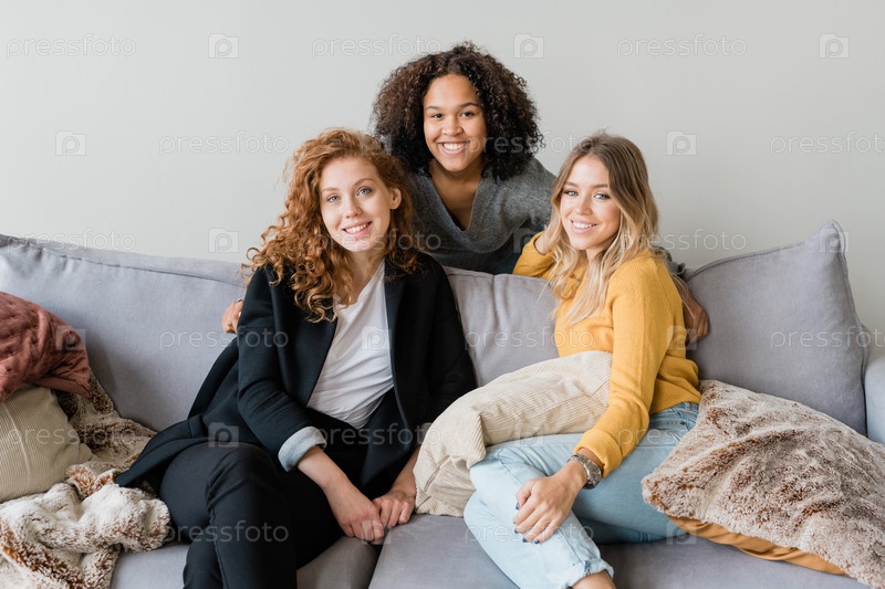 Группа дружелюбных межкультурных девушек в умной повседневной одежде, сидящих на диване