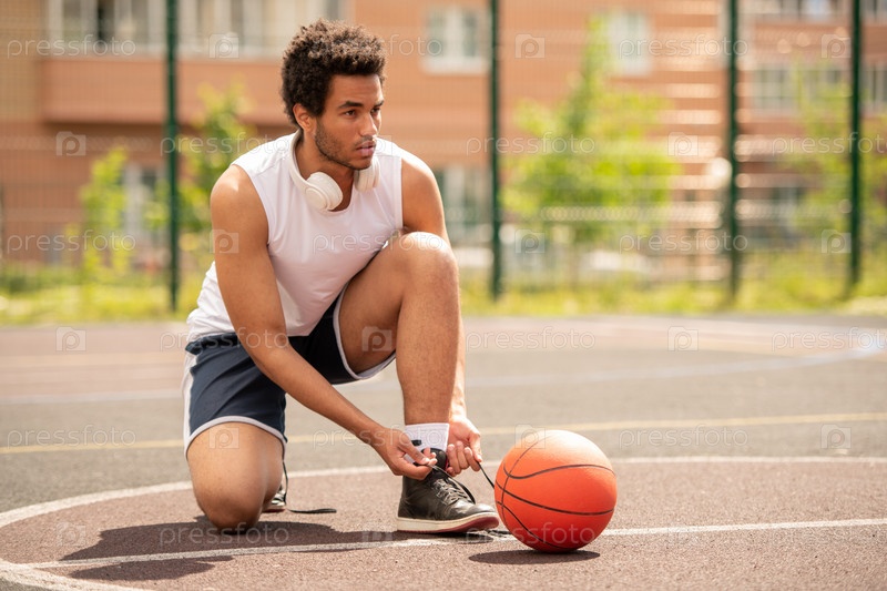 Молодой профессиональный баскетболист связывает шнурки кроссовок