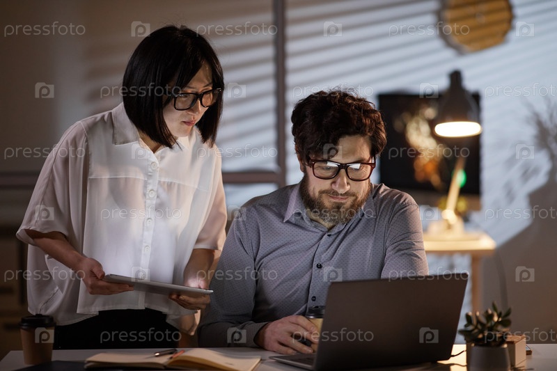 Коллеги работают до поздней ночи в офисе