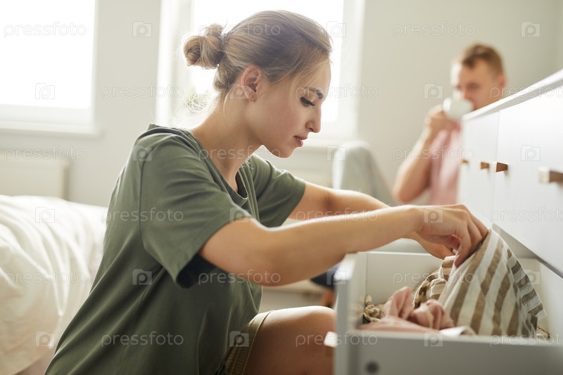 Красивая девушка, сидящая у открытого ящика в поисках новой одежды