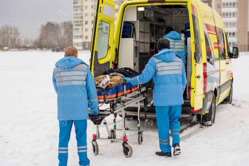 Парамедики толкают носилку с закрепленным без сознания мужчиной в машину скорой помощи
