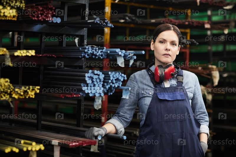 Портрет серьезной, жестокой молодой брюнетки в синих комбинезонах, стоящей на полках с цветными железными деталями на промышленном складе