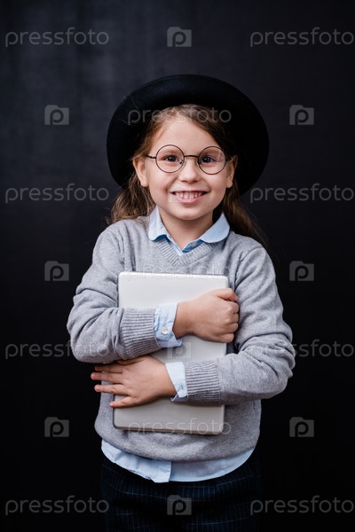 Веселая маленькая девочка с зубчатой улыбкой, держащая цифровой планшет за грудь