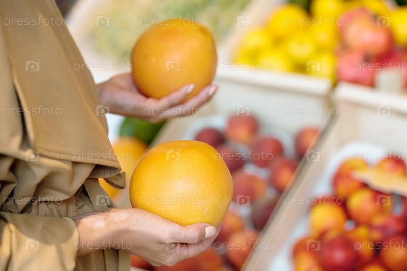 Руки молодой покупательницы, держащей свежеспелые желтые грейпфруты