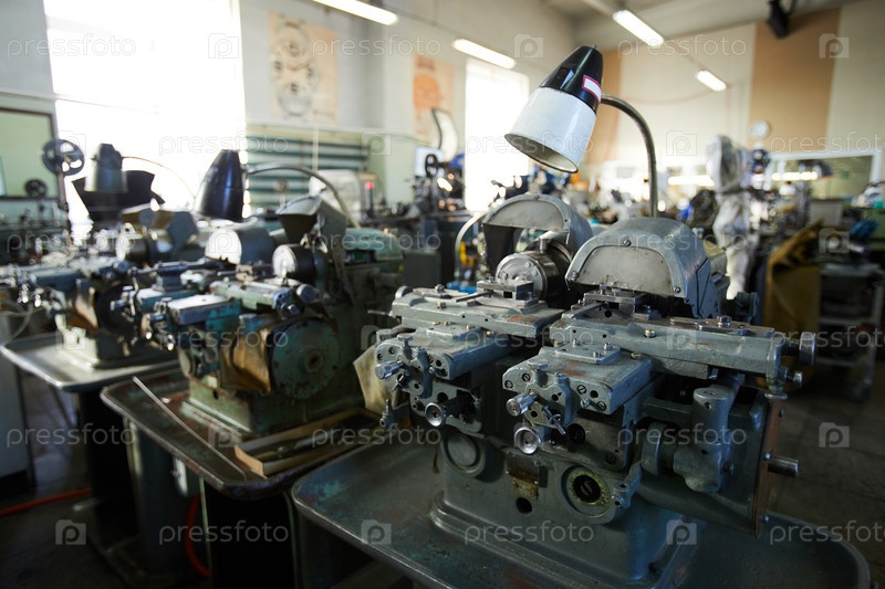 Маленькие токарные станки и электрические лампы в ряд, используемые для изготовления небольших редукторов кварцевых наручных часов, интерьера фабричного магазина