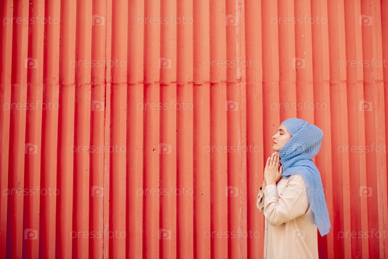 Молодая исламская женщина в повседневной одежде и хиджабе молится на красной стене